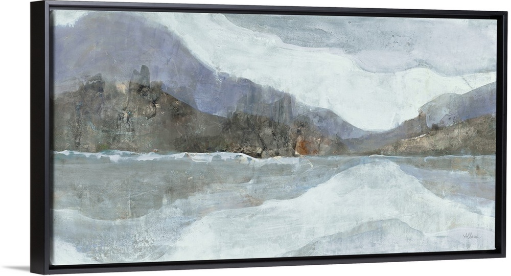 <p>Abstract painting of a mountainous Winter landscape with a lake in the foreground, in cool tones.</p>