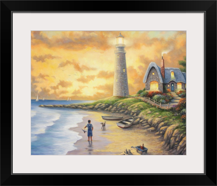 <p>A boy and his dog flying a kite on the beach near a lighthouse.</p>