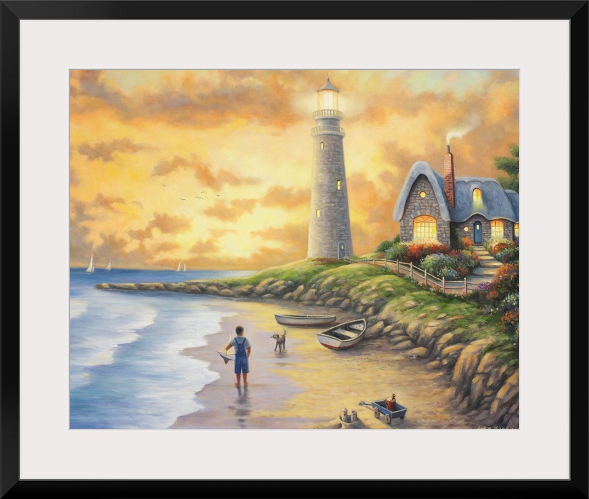 <p>A boy and his dog flying a kite on the beach near a lighthouse.</p>