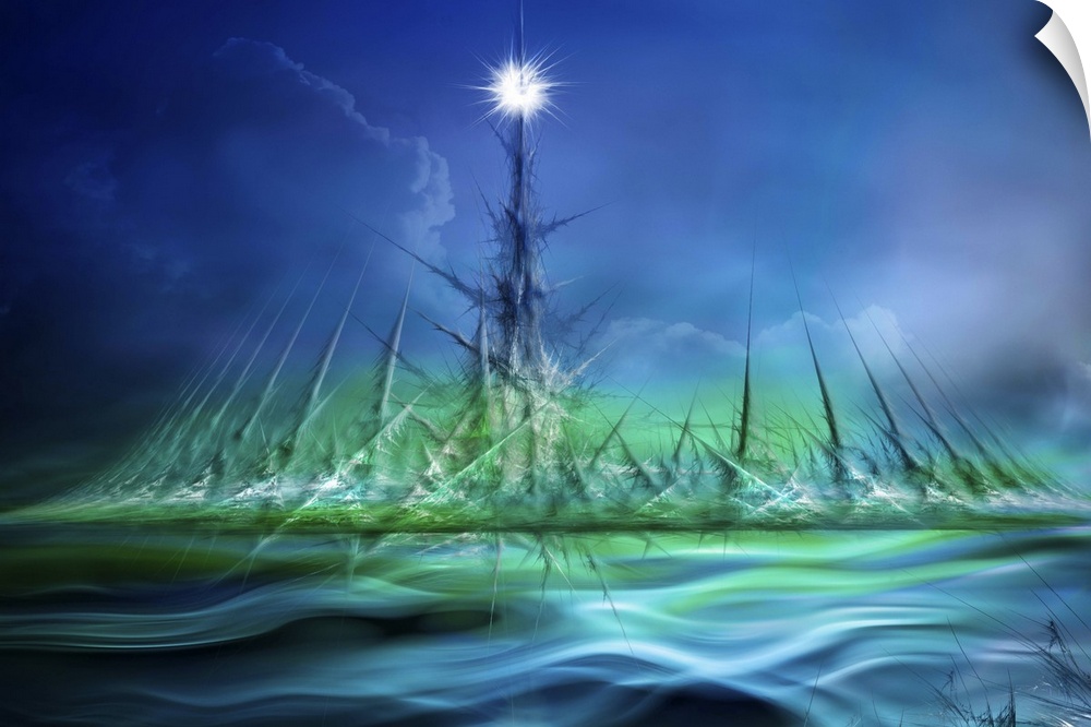 <p>Abstract digital art with Northern Lights colors, long sharp lines, and clouds over water.</p>