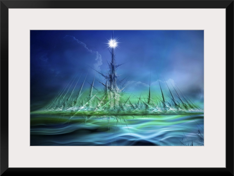 <p>Abstract digital art with Northern Lights colors, long sharp lines, and clouds over water.</p>