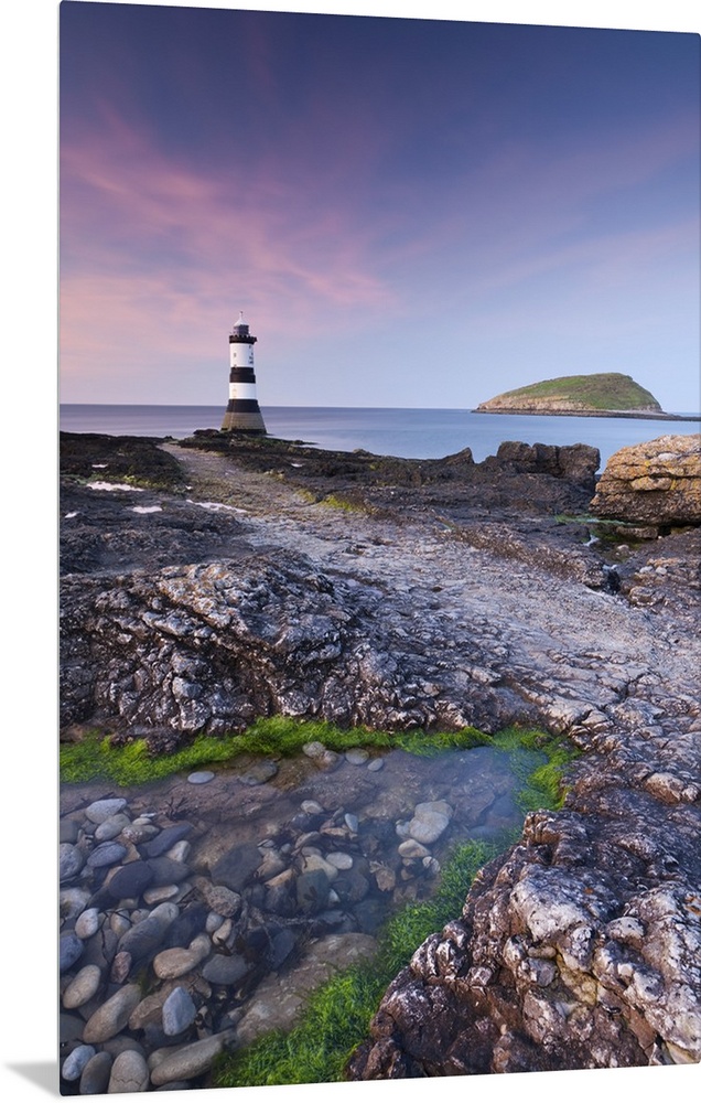 <p>Twilight on the rocky Anglesey coast looking towards Penmon Point Lighthouse and Puffin Island, Anglesey, North Wales, UK. Spring</p>