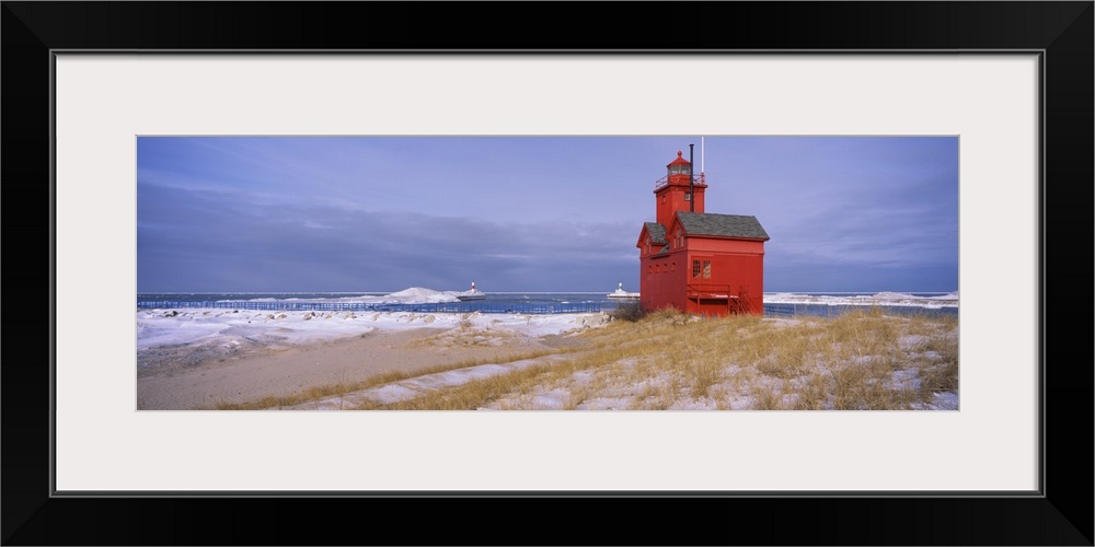<p>Big horizontal photograph of the Big Red Lighthouse against a blue sky, along the coast of Lake Michigan, in Holland, Michigan.</p>
