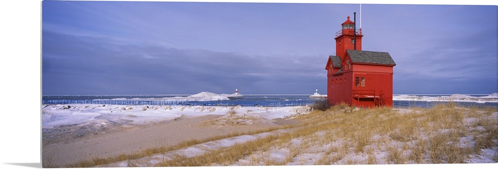 <p>Big horizontal photograph of the Big Red Lighthouse against a blue sky, along the coast of Lake Michigan, in Holland, Michigan.</p>