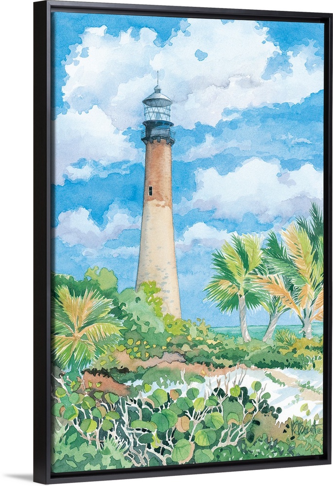 <p>Watercolor painting of a lighthouse against a cloudy sky on a tropical beach.</p>