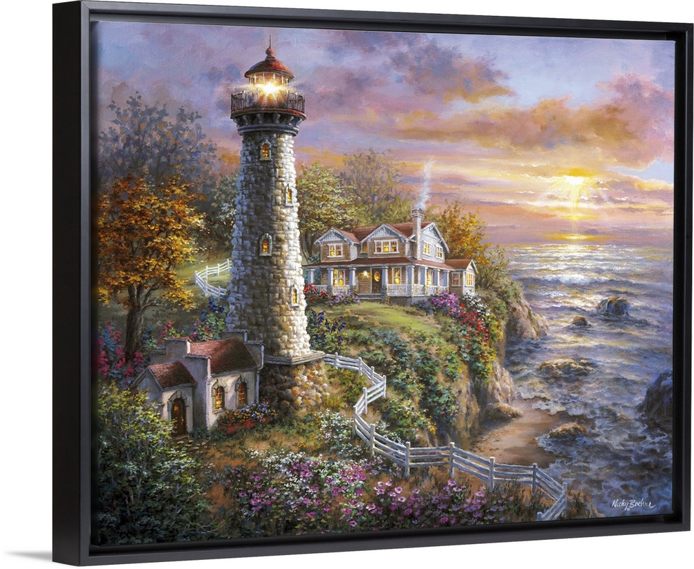 <p>Painting of a lighthouse at sunset. Product is a painting reproduction only, and does not contain actual lights.</p>