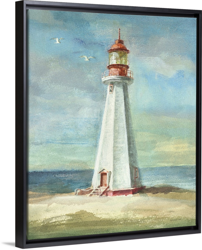 <p>Contemporary artwork of a white lighthouse on the coast.</p>