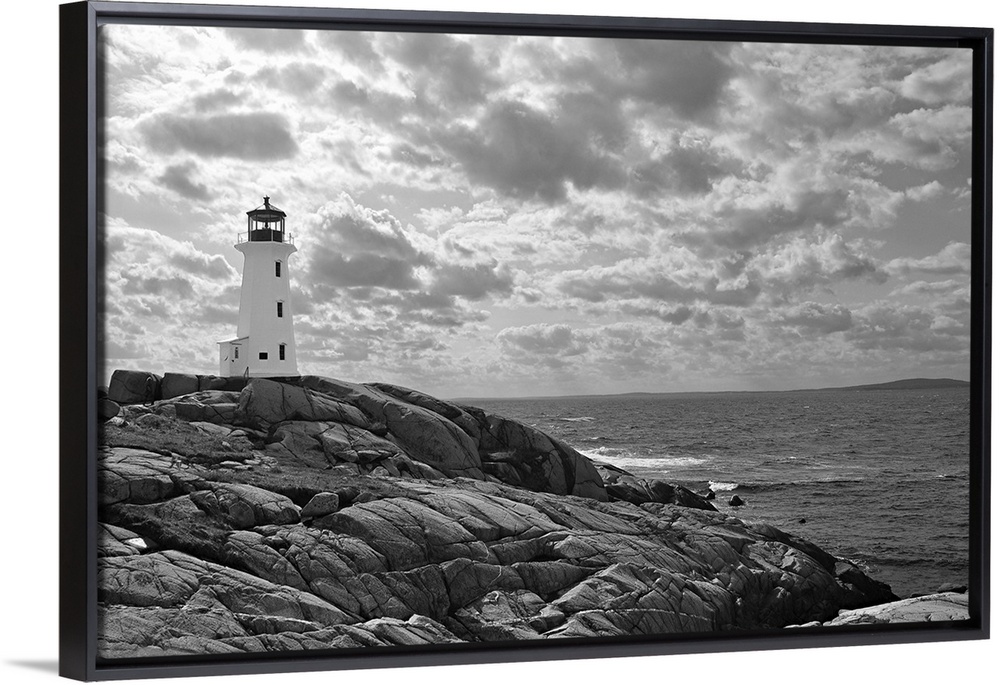 <p>Lighthouse at Peggy's Cove, Nova Scotia in black and white with dramatic clouds in sky.</p>