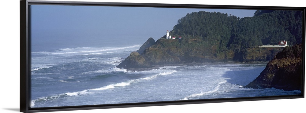 <p>Large, landscape photograph of waves rushing against the shore in Heceta Head, Lane County, Oregon, the Heceta Head Lighthouse on a hillside in the distance.</p>