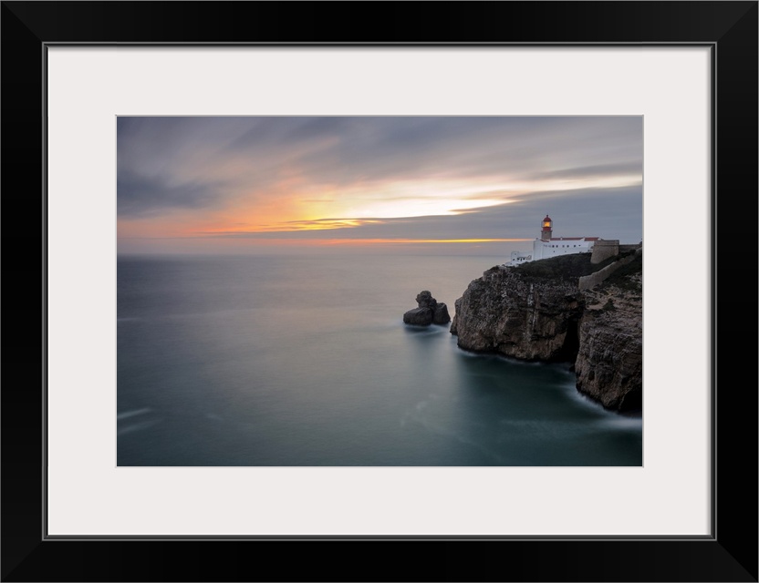 <p>Dusk lights up the lighthouse overlooking the Atlantic Ocean, Cabo De Sao Vicente, Sagres, Algarve, Portugal</p>