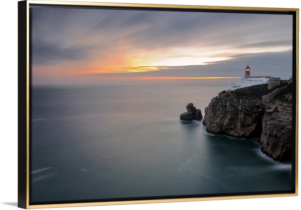 <p>Dusk lights up the lighthouse overlooking the Atlantic Ocean, Cabo De Sao Vicente, Sagres, Algarve, Portugal</p>