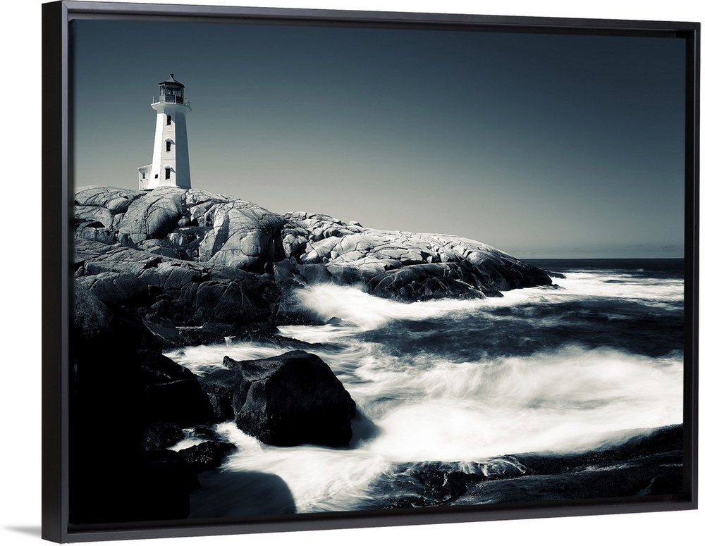 <p>A black and white image of Peggy's Cove Lighthouse in Nova Scotia, Canada.</p>