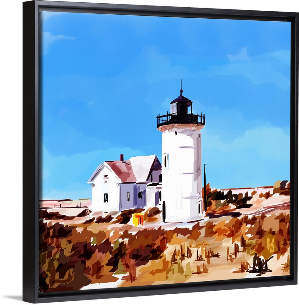 <p>Contemporary artwork of a lighthouse in front of a deep blue sky.</p>