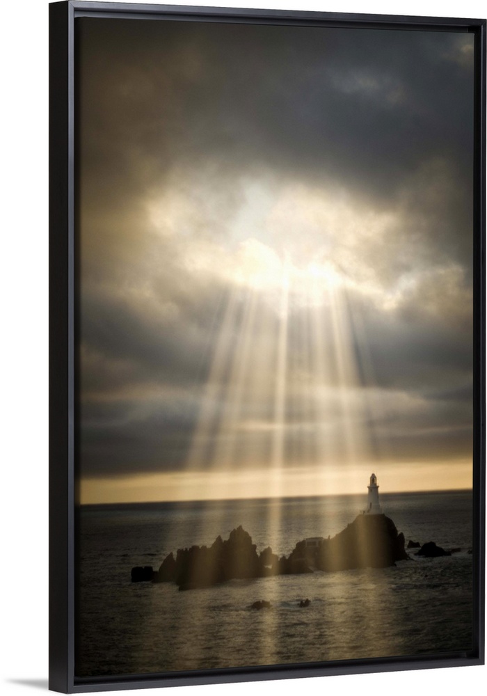<p>A lighthouse on a rocky island under a stormy sky being lit by sun rays appearing through a gap in the clouds.</p>