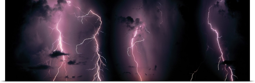 <p>Oversized, landscape photograph of numerous bolts of lightening, displaying clouds in the night sky, surrounded by blackness.</p>