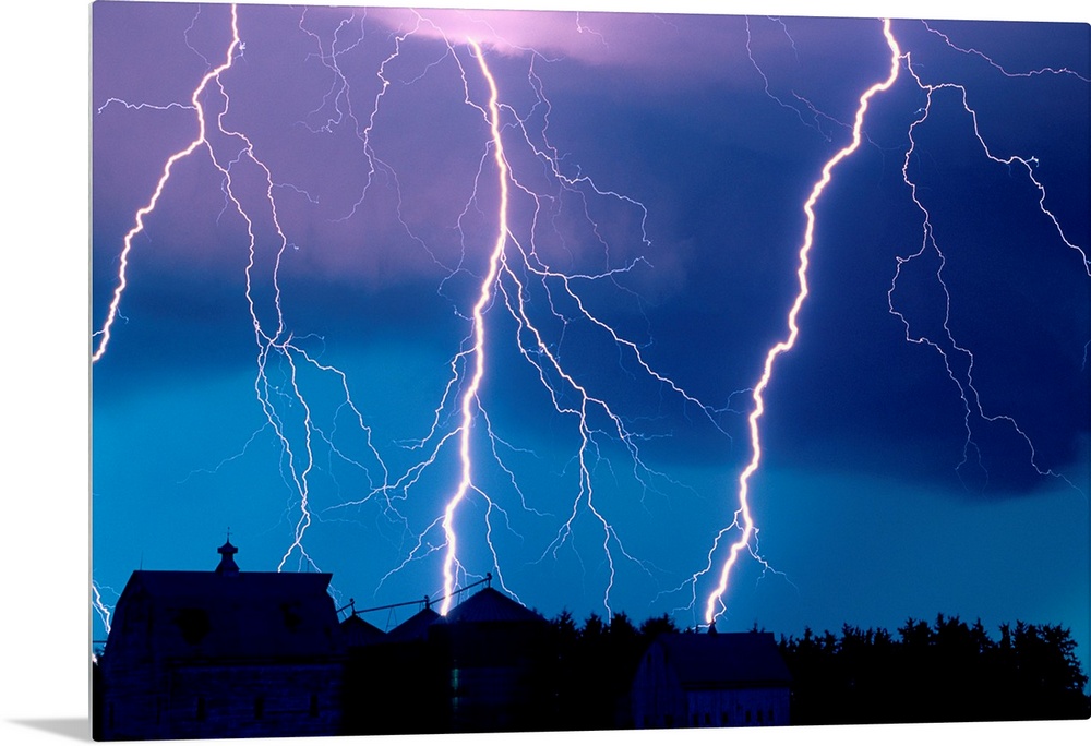 <p>Multiple lighting strikes raining down from the sky at night on a farm.</p>