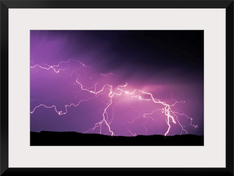 <p>Lightning in a purple sky during a storm in Yellowstone National Park, Wyoming, United States of America</p>
