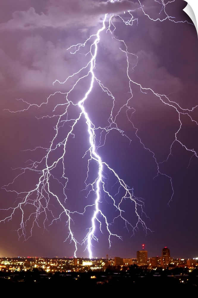 <p>Photograph of large lightning bolts striking in a purple sky above an Arizona city.</p>