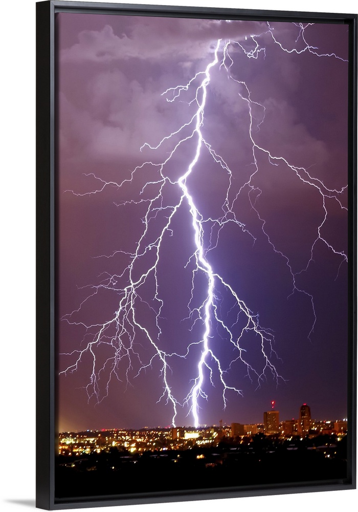 <p>Photograph of large lightning bolts striking in a purple sky above an Arizona city.</p>