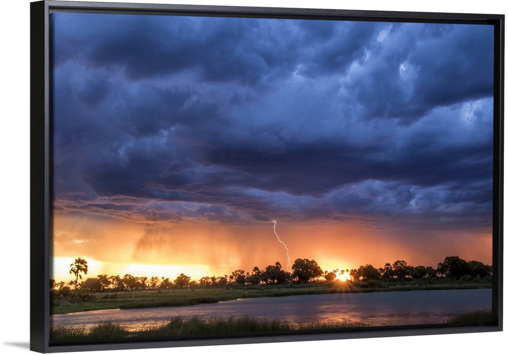 <p>Lightning shoots from a summer thunderstorm as the sun sets behind it, Okavango Delta, Botswana</p>