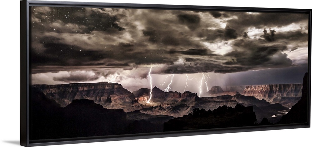 <p>Lightning storm at night over the Grand Canyon.</p>