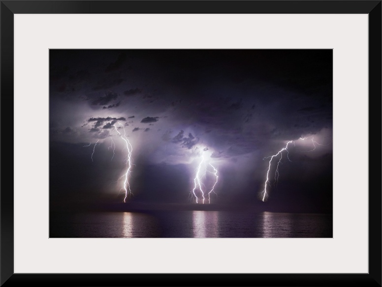 <p>Time-lapse photo of three bolts of lightning striking the ocean from storm clouds at night, illuminating the dark sea.</p>