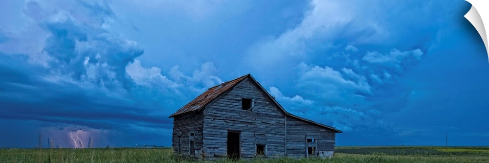 <p>Lightning strikes over the prairies as it approaches an old abandoned farm house; Val Marie, Saskatchewan, Canada</p>