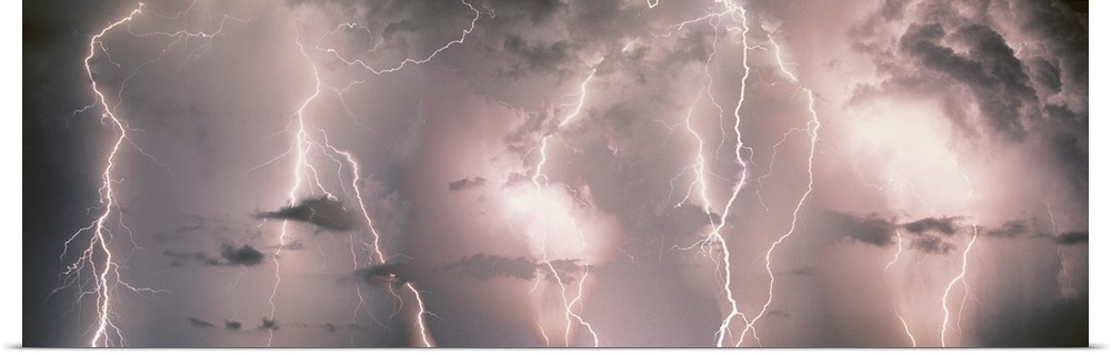 <p>Panoramic canvas of lightning strikes up close against a stormy lit up sky.</p>