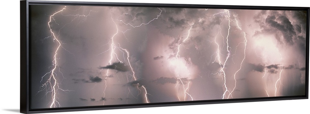 <p>Panoramic canvas of lightning strikes up close against a stormy lit up sky.</p>
