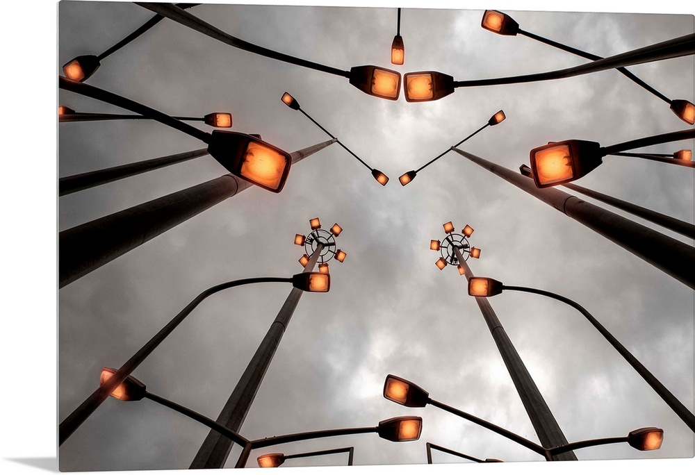 <p>Several street lights arranged in an abstract pattern.</p>
