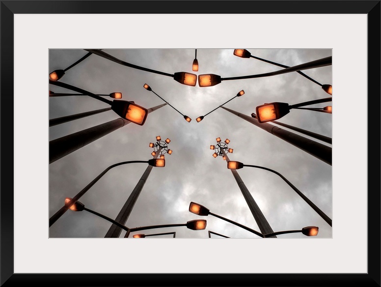 <p>Several street lights arranged in an abstract pattern.</p>