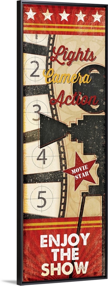<p>A digital illustration of "Lights, Camera, Action, Enjoy The Show" with a vintage appearance.</p>
