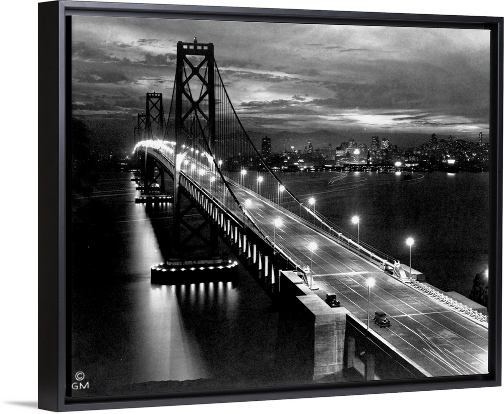 <p>Lights illuminate the San Francisco Oakland Bay Bridge after its completion in 1936. The bridge, designed by Charles H. Purcell, brought an end to ferryboats on San Francisco Bay, by linking San Francisco with Oakland. San Francisco, California, USA.</p>
