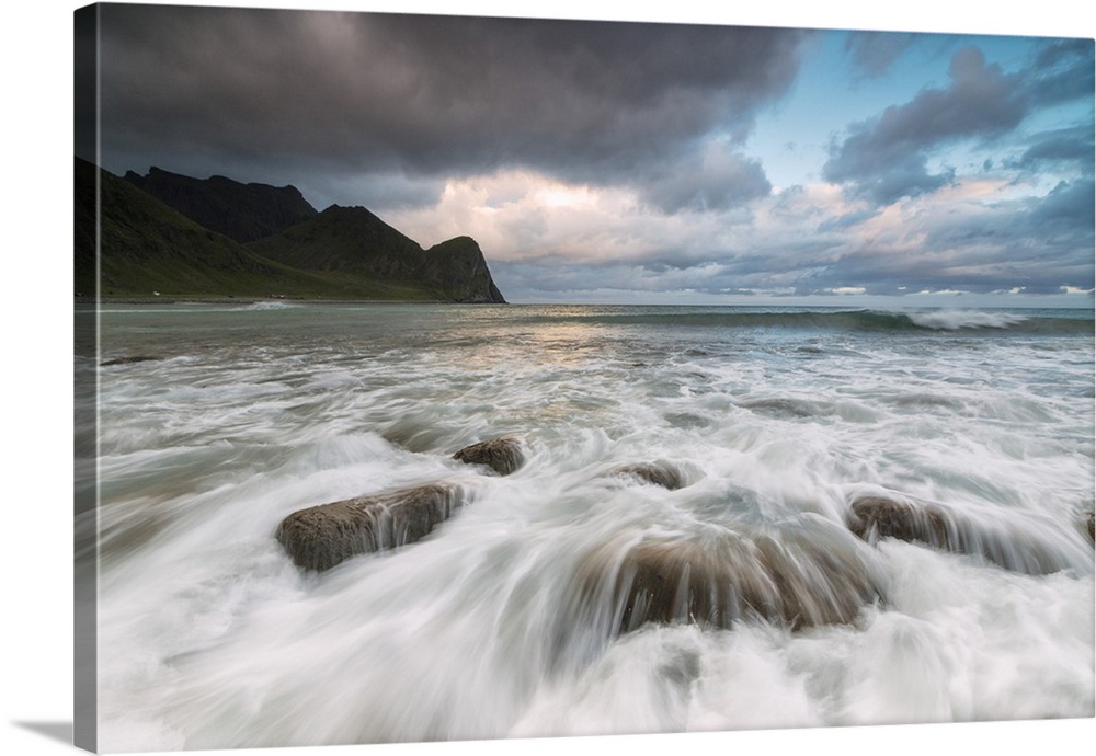 <p>Lights of midnight sun lights up the waves of the blue sea, Unstad, Vestvagoy, Lofoten Islands, Norway, Scandinavia</p>