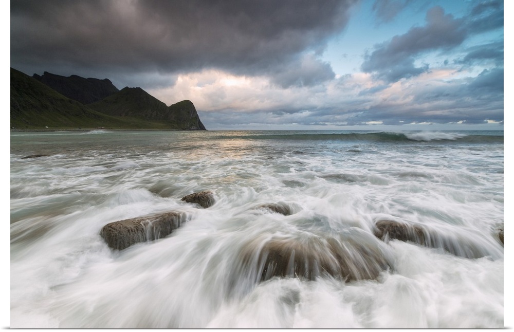 <p>Lights of midnight sun lights up the waves of the blue sea, Unstad, Vestvagoy, Lofoten Islands, Norway, Scandinavia</p>