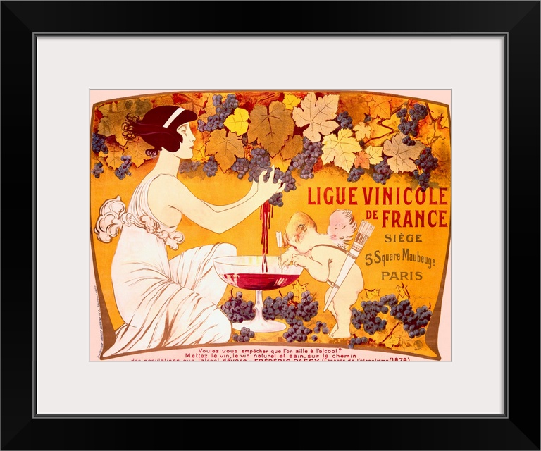 <p>Vintage styled poster of a woman squeezing juice out of grapes in to a giant wine glass with cupid stirring the mixture with his arrow.</p>
