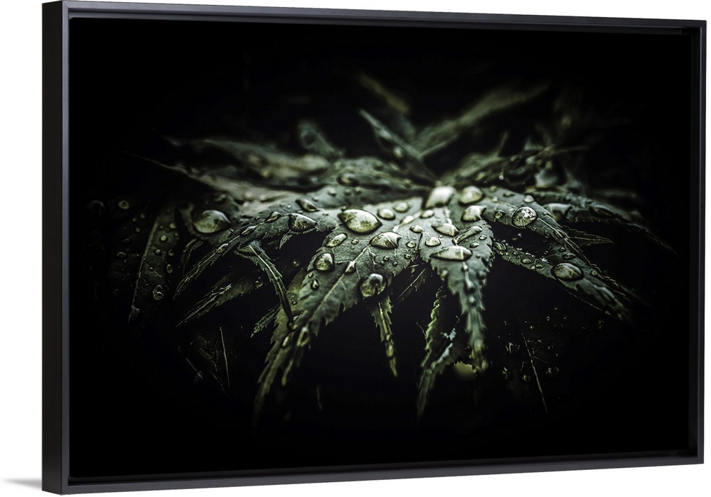 <p>Raindrops glisten on the dark green leaves, adding a touch of brightness to the otherwise shadowy scene. The close-up focus on the droplets highlights the natural beauty of the plant life.</p>