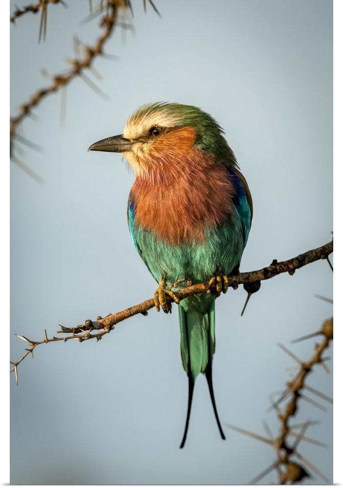 <p>Lilac-breasted roller (Coracias caudatus Linnaeus) on whistling thorn looks left, Cottar's 1920s Safari Camp, Maasai Mara National Reserve; Kenya</p>