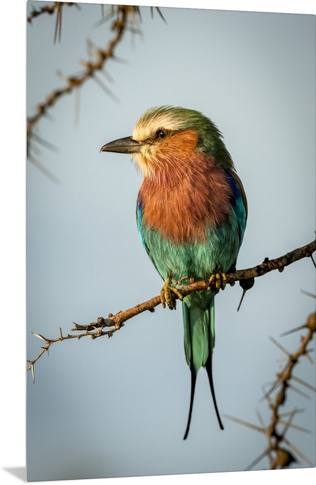 <p>Lilac-breasted roller (Coracias caudatus Linnaeus) on whistling thorn looks left, Cottar's 1920s Safari Camp, Maasai Mara National Reserve; Kenya</p>