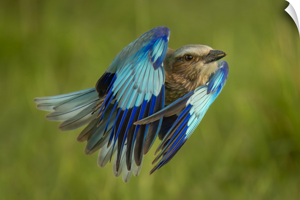 <p>Lilac-breasted roller (Coracias caudatus) flies with wings folded up in Maasai Mara National Reserve; Narok, Masai Mara, Kenya.</p>