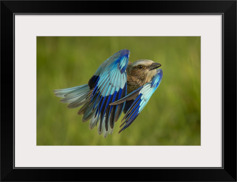 <p>Lilac-breasted roller (Coracias caudatus) flies with wings folded up in Maasai Mara National Reserve; Narok, Masai Mara, Kenya.</p>