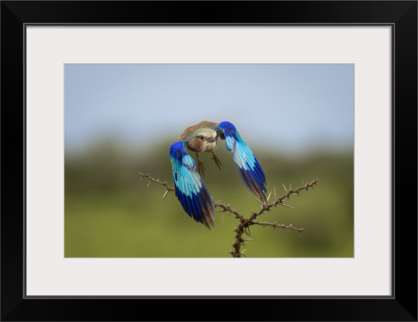 <p>Lilac-breasted roller (Coracias caudatus) lowers wings over whistling thorns (Vachellia drepanolobium) in Maasai Mara National Reserve; Narok, Masai Mara, Kenya.</p>