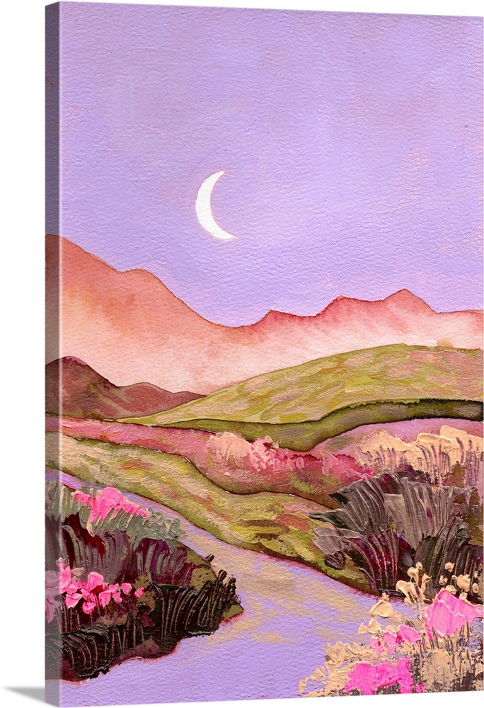Lilac Sky And Moon Over Flowery Pink And Green Fields