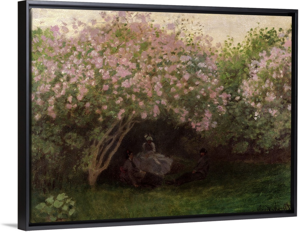 <p>Landscape, large classic wall painting of several small figures sitting on the grass, beneath the shadows of large lilac bushes.</p>