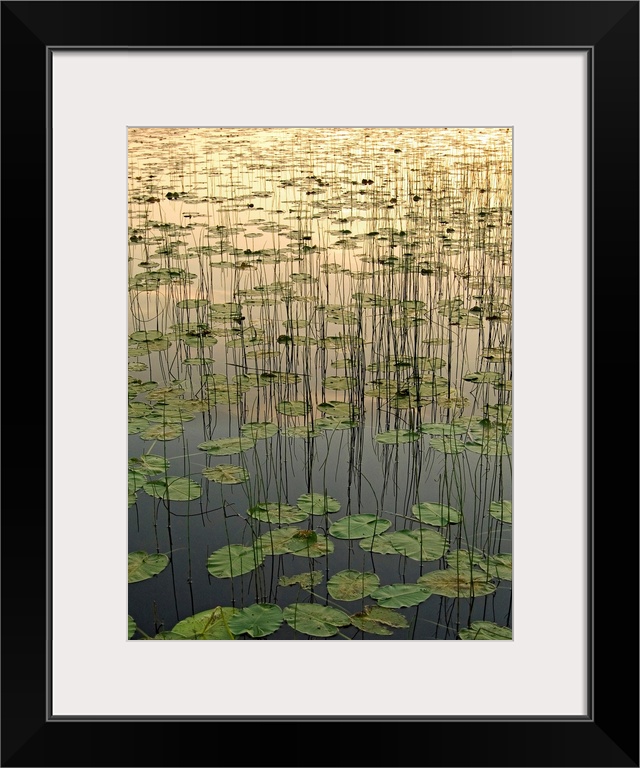 <p>Portrait, vertical photograph of Deadman Lake full of lily pads at Sunset, in Tetlin, Southecentral Alaska.</p>