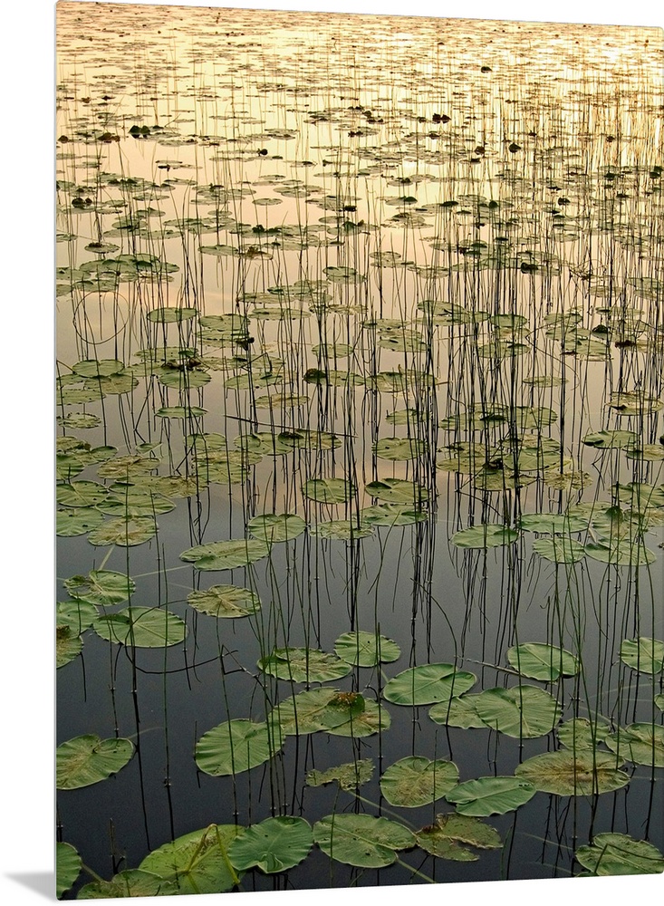 <p>Portrait, vertical photograph of Deadman Lake full of lily pads at Sunset, in Tetlin, Southecentral Alaska.</p>
