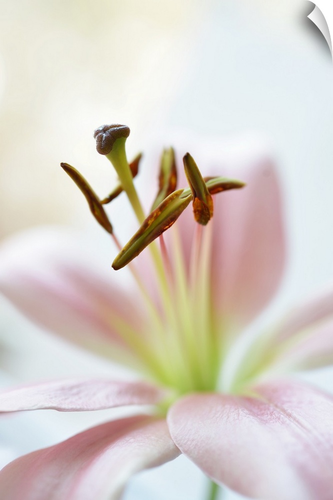<p>The stamen and pistil of a lily standing out against the pale pink petals.</p>