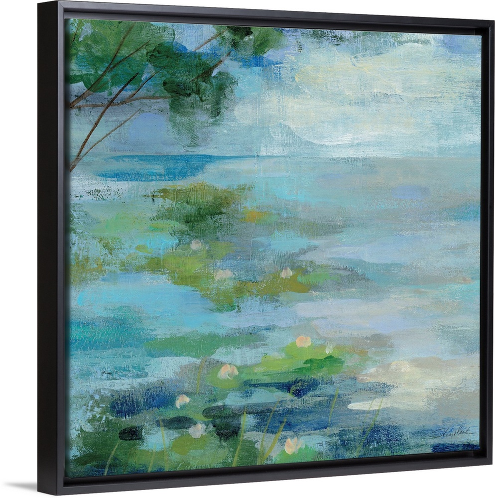 <p>Contemporary painting of green lilypads in a calm blue pond.</p>