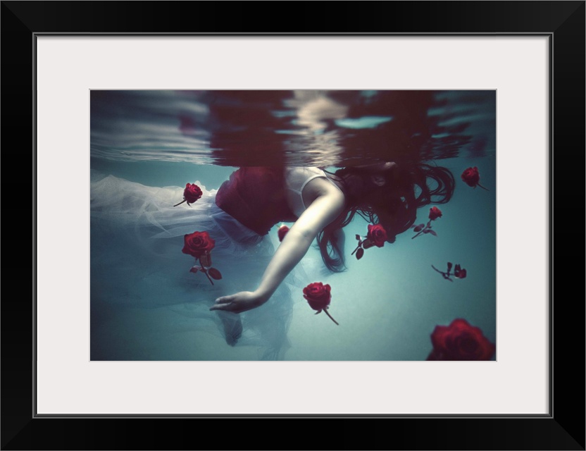 <p>A conceptual photograph of a woman in a white dress floating underwater with red roses.</p>