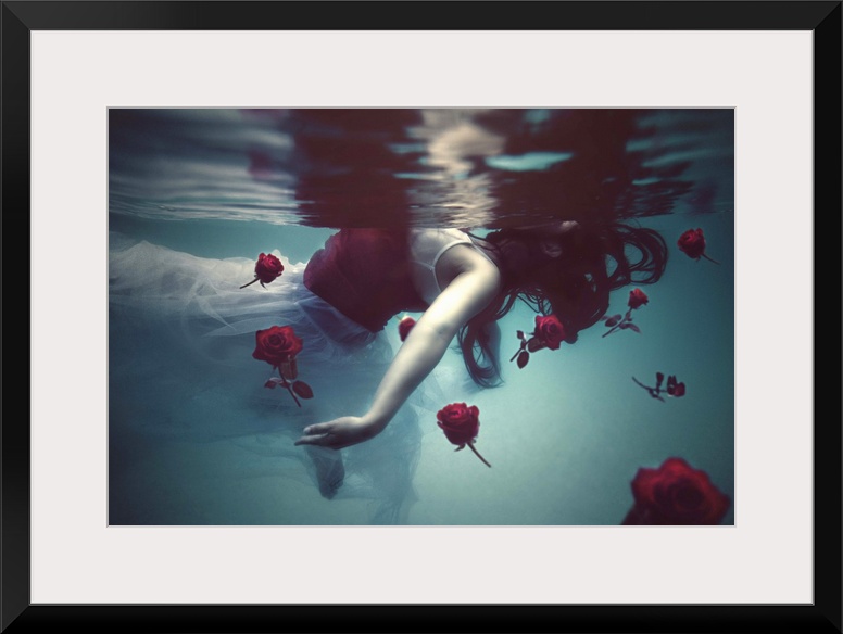 <p>A conceptual photograph of a woman in a white dress floating underwater with red roses.</p>